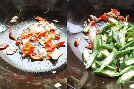 炸好肉油以后将五花肉捞起来,转大火,加入切好的生姜、大蒜、大葱和红辣椒,翻炒至有香味飘出,倒入炒好的肉片,加入适量的食盐,翻炒均匀后倒入切成片的秋葵,倒入适量的酱油,加入少许的胡椒粉和鸡精,喷洒上一点点水,翻炒均匀后盖上锅盖焖半分钟。焖好以后,开锅稍微翻炒一下就可以关火出锅了。