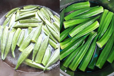 第二步,处理秋葵。将秋葵用淡盐水清洗一下表面的污渍并稍微浸泡一下,去一下表面的农残。清洗干净以后将秋葵捞起来放在一旁沥干水分。往锅中加入适量的清水,将秋葵整个放入水中,大火将水烧至沸腾,用锅铲搅拌一下锅中的秋葵,让它受热均匀。