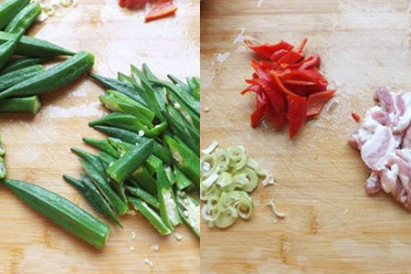 第三步,切洗食材。将焯水以后的秋葵用刀斜着切成大小均匀的片状,放在盘子中待用。将五花肉清洗干净以后控干水分,再用吸水纸吸一下表面的水分,防止炸肉油的时候爆油,烫伤自己。将处理好的五花肉切成大小适宜的肉块,放在一旁。将生姜、大蒜、红辣椒和大葱都清洗干净,切成适宜的形态,分开放好备用。