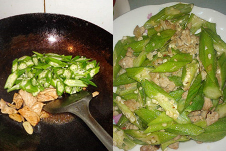 然后,将切好的秋葵在开水里面焯一下。接着,在锅里面倒油,等油热了之后,放入肉片炒香。接着,再加入红辣椒和葱姜蒜接着炒出来香味。然后加入适量食盐、味精等调味料,翻炒之后再将秋葵倒入锅中。翻炒至炒熟就可以了。【女物原创未经允许,谢绝转载!】