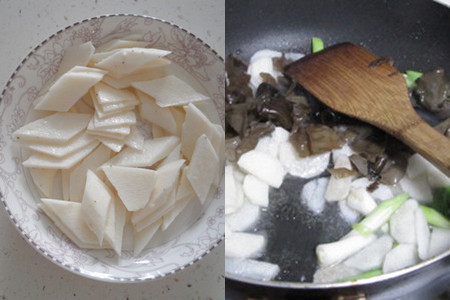 一:将山药洗干净去皮,木耳放入水中去泡发。山药切片,然后放入水中氽一下。