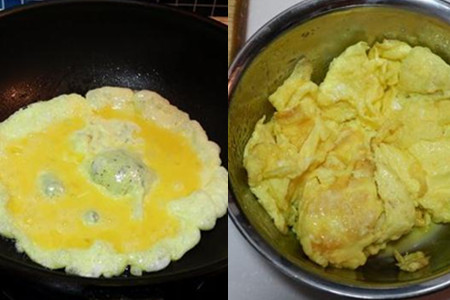 第三步,煎鸡蛋饼。打几个鸡蛋在干净的碗中,加入少量食盐搅拌均匀并稍稍打发一下。将锅清洗干净并擦干里面的水分,开大火将锅烧热,倒入多一点的食用油,将打发好的鸡蛋液倒入锅中,转中小火煎鸡蛋,鸡蛋一面煎黄以后将它翻个面继续煎,鸡蛋在油锅中很容易就能煎好,所以煎鸡蛋的时候一定要守在锅旁,以免鸡蛋煎糊。
