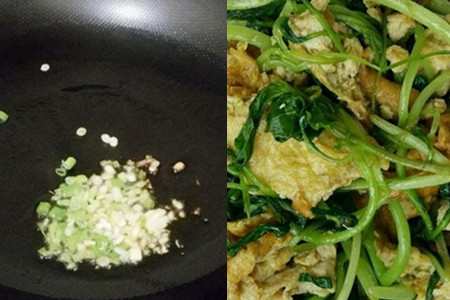 第四步,鸡毛菜炒鸡蛋。将中小火转大火,倒入切好的生姜和大蒜,翻炒至闻到蒜香味,将沥干水分的鸡毛菜倒入锅中,加入适量的食盐,大火翻炒。鸡毛菜很容易炒熟,大火炒的时候要记得不停翻炒,不然受热不均匀会造成鸡毛菜生熟不一,鸡毛菜炒熟以后就会变得绵软,颜色加深,这时倒入炒好的鸡蛋块,撒上适量的鸡精,翻炒均匀后就可以出锅了。