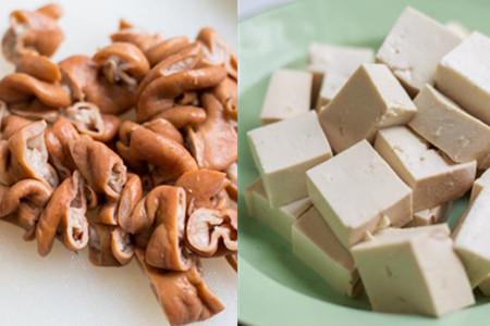 食材:熟肥肠200克、豆腐250克、辣椒、生姜、花椒、盐、油、香菜。