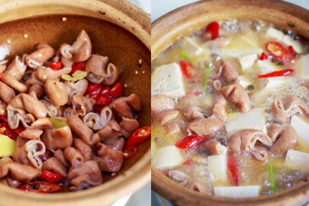 取一口干净的砂锅,置于灶上,注入适量食用油,开中火加热,油温升高之后,下生姜、花椒和辣椒煸炒。炒出香味后,将烫过的肥肠下锅,一起煸炒。接着倒入适量开水,调至小火煮十五分钟。十五分钟后,把切好的豆腐块下锅,继续煮十五分钟。然后调入适量食盐,加入香菜末即可关火。
