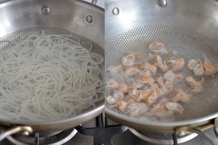 粉条用温水泡软。取一口干净的炒锅,置于灶上,加入适量清水,开大火煮沸,放入泡好的粉条,煮熟后捞出滤干水分。把锅里的开水倒掉,重新加入适量清水,大火煮开,将切好的肥肠下锅,煮几分钟捞出滤干水分。