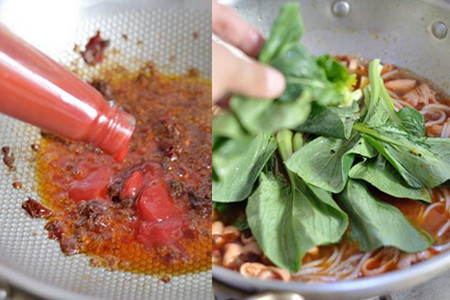 把炒锅里的水倒掉,注入适量食用油,油温升高后,挖入一勺豆瓣酱,小火煸炒。炒出红油之后,加入适量番茄酱,炒匀。接着把烫过的肥肠下锅,翻炒均匀,注入适量清水,调入少许食盐和白醋,调至大火煮开。煮开之后,放入滤干水分的粉条,青菜洗干净下锅,用铲子翻炒均匀,继续煮一分钟即可关火。