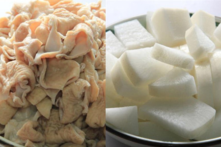 肥肠处理干净,放入开水锅里煮几分钟,捞出滤干水分,切成小段。生姜去皮切成片,大蒜剥皮备用,白萝卜洗干净切成小块。