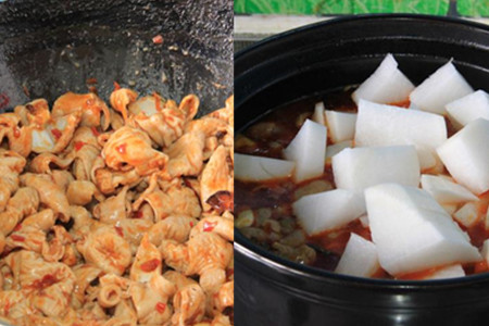 食材:肥肠500克、白萝卜250克、豆瓣酱、酱油、大蒜、姜、花椒、八角。