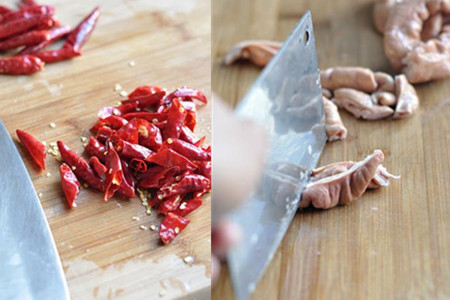 食材:熟猪肥肠300克、红辣椒、生姜、大葱、麻椒、盐。红辣椒洗干净切小段,生姜去皮切细条,大葱洗净切斜段,肥肠切成小段。