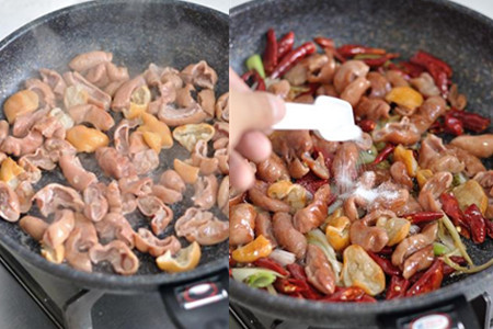 取一口平底锅,置于灶上,开小火预热,倒入切好的肥肠煎制。肥肠煎出油并且颜色变金黄后,盛出备用,肥油就在锅底。用锅里剩下的肥油将姜条和葱段炒香,放入一些麻椒,一起煸炒。炒出香味后,将红椒段下锅,一起煸炒。红椒炒香之后,将肥肠段回锅,调入适量食盐,翻炒均匀就可以熄火装盘了。【女物原创未经允许,谢绝转载!】