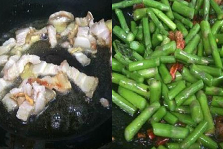 第四步,炒菜。将锅擦洗干净,开大火烧热,倒入适量的食用油,将生姜大蒜倒入锅中,翻炒至香味飘出,将切好的五花肉倒入锅中,翻炒,加入适量的食盐、酱油和香醋,五花肉翻炒过程中会炸出很多油水,五花肉的体积也会慢慢变小,待五花肉中的肥肉油水炸得差不多的时候将切好的芦笋倒入锅中,大火翻炒。