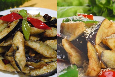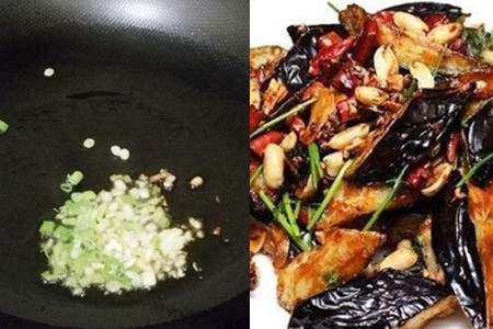 第四步,炒制风味茄子。将锅中多余的油倒出来,留一点点底油就可以了。将切好的干辣椒、生姜和大蒜碎末倒入锅中,再加上适量的花椒,大火翻炒至锅中飘出佐料的香味,倒入切好的青椒,再加入一勺白砂糖,翻炒融化,将沥干油分的茄子倒入锅中翻炒,加上适量食盐和鸡精,翻炒均匀就可以出锅了。