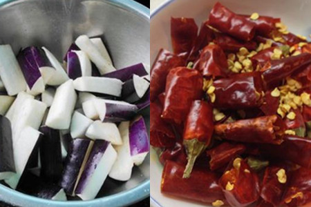 将冲洗干净的茄子切成个头均匀的菱形小块。当然,茄子切开以后容易氧化变色,所以茄子切开以后不要放置太久不吃。青椒清洗干净去掉梗和内部的白籽,切成大小适宜的块状。干辣椒提前用剪刀剪成小块,生姜大蒜和香葱都切碎放在一旁待用。