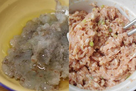 第二步,制作虾仁馅儿。将基围虾去头部和外皮,并用牙签将基围虾尾部的虾线挑出来,将处理好的虾仁放在清水中清洗一下,沥干水分后剁碎成肉末。将猪肉切碎,加入到虾仁碎末中,将切好的香葱撒上去,继续剁,一边剁一边将肉搅拌一下,让它们混合均匀,想要肉滑嫩上劲,剁肉的时候要多剁一会儿,尽量剁得碎一点。
