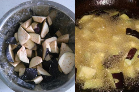 第三步,炸茄子。想要茄子绵软柔滑,炸茄子的时候要注意火候。将油倒入锅中大火烧至五分热,将裹上淀粉的茄子倒入锅中炸,这里为了茄子炸得透彻,不要将茄子一次性都倒进去,可以分两次倒进去炸至黄色后将茄子捞起来沥干油分,再开大火将油温烧至8分热,将所有的茄子都倒进去再炸一次,让茄子上色均匀。