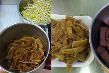将主要的荤素食材切好倒入熬好的汤汁内,烧开以后倒在盆子里。末了,再把植物油烧热,放入点儿葱末,迅速浇在毛血旺上就可以了。