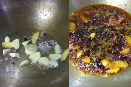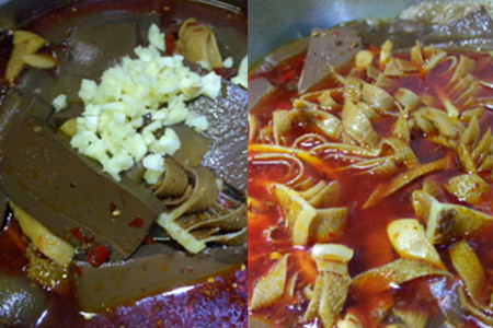听完了它里面的构成,若能简单地了解一下做法,在家就可以吃到美味的毛血旺啦。这道菜比较重要的一点是熬汤。熬好的关键是要把火候给掌握好,加入油后,放入豆瓣酱,辣椒、麻椒,开小火,再放入姜和蒜,飘出来香味既可关火。熬好之后把废渣捞出,接着放入味精,醋等调料。