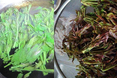 第二步,处理好食材。将香椿放在水盆中,加入少许食盐,再加入适量的清水,将香椿搓洗一下后浸泡在盐水中,大概二十分钟,去一下香椿中的隐藏的幼虫和枝叶表面的农药残留。香椿清洗干净以后,将它捞起来放在清水中再冲洗一遍,沥干水分就可以备用了。香椿是比较干净容易清洗的蔬菜,去一下农残就可以食用了。