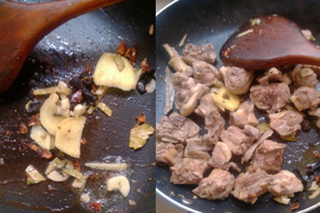 加入冰糖和料酒,继续翻炒锅中的鸭子肉,直到鸭子肉表皮卷曲收缩,鸭子肉7分熟的时候就可以停止翻炒了。