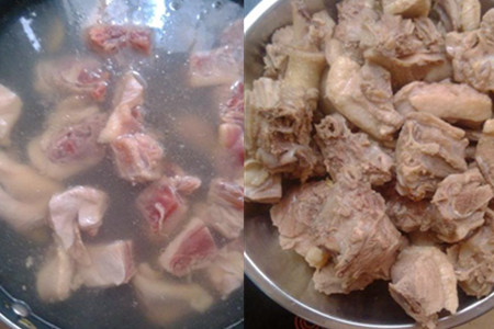第二步,处理鸭子肉。将鸭子肉放在淡盐水盆中浸泡清洗干净,再打一盆清水,将鸭子肉放在盆中洗干净,并剁成均匀的小块。在剁块的时候尽量剁小一点,这样能够有效的去除鸭子的腥臊味道,避免残留,影响食欲。将剁好块的鸭子肉放入锅中,加入适量的清水将鸭子肉淹没,放入生姜片,倒入适量的料酒。大火烧开锅中的水。
