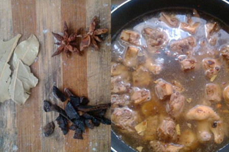 第四步,卤制鸭子肉。往锅中倒入适量的水淹没炒好的鸭子肉,将陈皮、香叶和八角倒入锅中,用锅铲将佐料按压进汤里,这样比较容易出味。将锅盖盖上后大火焖煮半小时,这时候鸭子肉熟透了并带着醇香气息,将锅中的鸭子肉翻炒一下,大火收一下锅中的汤汁,让鸭子肉更加入味。翻炒好以后就可以将鸭子肉出锅了。