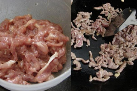 第三步,炒肉丝。将锅内的水分擦干后倒入适量的食用油,大火将锅烧热后倒入腌制好的肉丝。肉丝腌制好以后会结成一团,放入油锅中后,要用锅铲迅速将肉团搅开,让肉丝松散并受热均匀。肉丝炒好以后会变成暗淡的猪肝色,这时候关火将肉丝盛放在碗中。