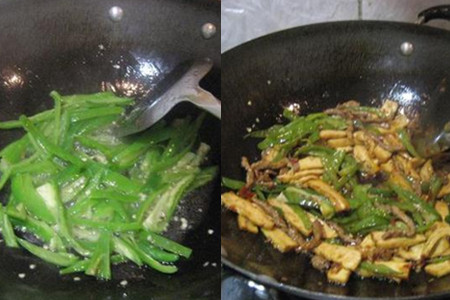 第四步,炒菜。往锅中再放一点食用油,开大火。将生姜末和青椒丝倒入锅中翻炒,青椒丝很容易就会炒熟,看见青椒丝炒至绵软的时候基本就熟了,这时倒入切成薄块的香干,加入适量的食盐、豆瓣酱、白砂糖和花椒粉,翻炒均匀后,再翻炒2分钟,让香干彻底受热并均匀裹上佐料。