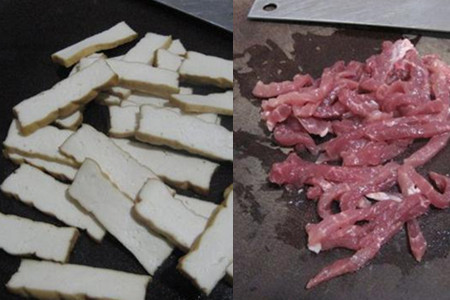 第二步,处理食材。将香干用清水稍微冲洗一下,沥干表面的水分。将香干切成大小均匀的薄片,放在碗中备用。将肉用清水清洗干净后沥干水分,用吸水纸吸一下比较好,不然炒肉的时候会爆油。将吸干净水分的猪肉切成长短适宜的肉丝,可以尽量切细一点,这样吃起来也比较有感觉。