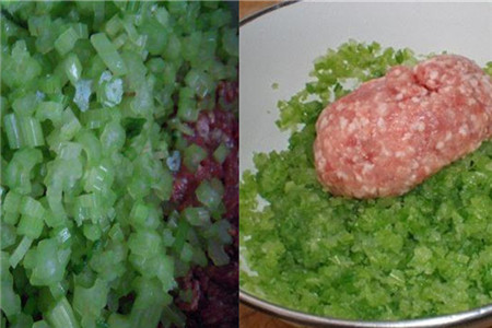 2.芹菜我们要买小的本地芹菜,不要买大大的西芹,西芹只适合炒菜,芹菜洗干净之后我们要把它放开水里面烫软,注意不要烫太过,否则不好吃了,刚刚变身就要捞起来用凉水冲冷,接着切碎,切碎要把水分挤去。
