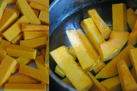 3、在锅中倒入适量的清水,把之前准备好的南瓜条放入其中,炖煮三五分钟的样子。具体的炖煮时间要根据南瓜的量来决定,煮至南瓜条七八分熟就可以捞出,沥干多余的水分。