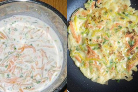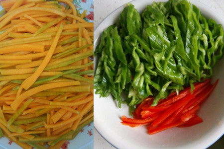 2、在煮锅中下入适量的水,把南瓜丝放入蒸锅中蒸软。趁着蒸南瓜丝的片刻,我们开始处理南瓜薄饼的配料。把青红椒择去蒂,放在淡盐水中浸泡片刻,便可把捞出再次冲洗一遍,接着用刀将青红椒切成细丝。