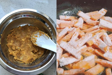 5、在炒锅中下入适当的食用油,油的量不宜过多,以免吃起来太油腻。把蛋黄加入油锅中,逐一加入些许的鸡精、盐调味,翻炒至蛋黄开始起泡。这时候,就可以把备好的南瓜条放入其中,反复翻炒使蛋黄充分地裹在南瓜条上就可以食用了。