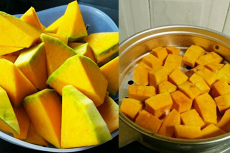 2、在蒸锅中加入适当的清水,把南瓜块放入蒸锅中,蒸上二三十分钟左右。具体的蒸煮时间要根据南瓜的大小来决定,不过一定要蒸到南瓜能够用筷子刺透为止。