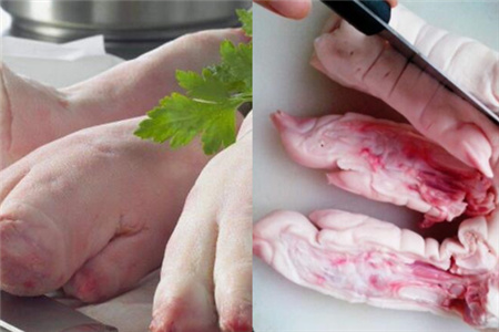 这道菜的两大原材料都需要进行一定的处理才能烹调,先来看看猪蹄。新鲜的猪蹄应该整体呈现白色,蹄尖部为红色。这种猪蹄比较健康,如果颜色发灰发暗就说明不新鲜了,这种不要买。
