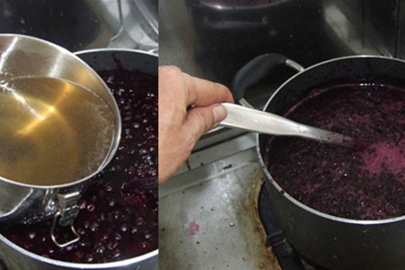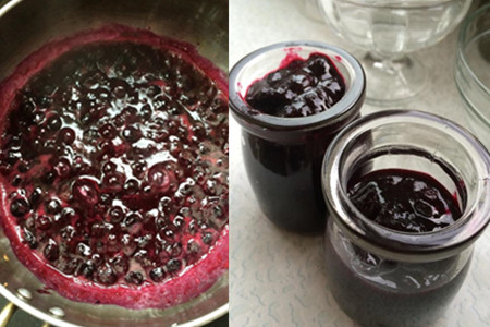 下面就是加入白砂糖的时间了。依然是小火加热,把白砂糖倒入锅中继续加热,搅拌均匀。等到白砂糖全部都融化,继续搅拌,大约二十分钟之后我们的果酱便可以完成。注意火候的控制,如果为了速度而加大火力很容易就会把蓝莓酱烧焦的。
