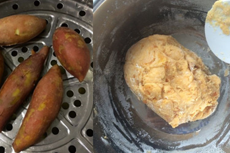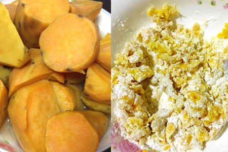 先把新鲜的红薯蒸软,然后压成泥状,里面加入适量的的糯米粉和白砂糖,将它们搅拌均匀。