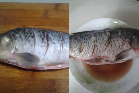 将鱼放在砧板上,用刀在鱼背划开几条口子,两面都划上几刀。再将生姜大蒜切成碎末放一些在鱼肚子里并倒入适量的料酒和食盐,用手将料酒和食盐混合起来后涂抹在鱼外皮上,涂抹好以后,将鱼放入冰箱内腌制半小时以上。