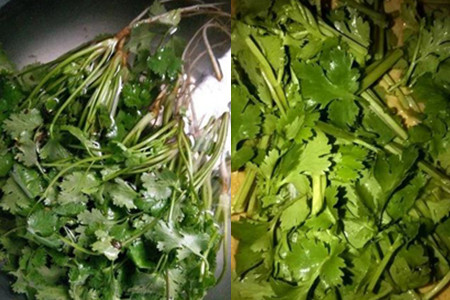 这样浸泡清洗能够洗得更加彻底,也能去除菜叶中的小虫和残留在上面的农药。浸泡够时间以后,用手稍微搓一下香菜,不要用太大的力,将香菜捞起来后倒掉原来的水,再打一盆清水,将香菜放进去再洗一遍,如果盆底还有泥沙,说明洗得不够干净,需要再洗一遍,直到盆底没有泥沙才能说明洗干净了。将清洗干净的香菜切成长度适宜的小段。