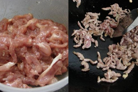 第三步,炒肉。将购买好的猪肉放在水龙头下用干净的清水冲洗一下,用吸水纸将肉表面的水分吸一下再将肉切成大小合适的肉片放在碗中,往碗中加入适量的料酒、食盐和酱油,将肉与佐料搅拌均匀后腌制十分钟。往锅中倒入适量食用油,大火将锅中的油烧热,将切好的肉片倒入锅中翻炒,炒制肉片表面的颜色变成淡淡的黄色后将肉盛出来。