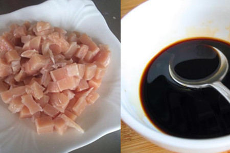 1、先将买回来的鸡胸肉清洗干净表面的血水,再用刀切成小丁状。再往里加入些许的盐、料酒、淀粉和适当的清水,用筷子搅拌均匀,腌制半个钟头左右。如果不喜欢鸡胸肉,也可以使用鸡腿肉替代。