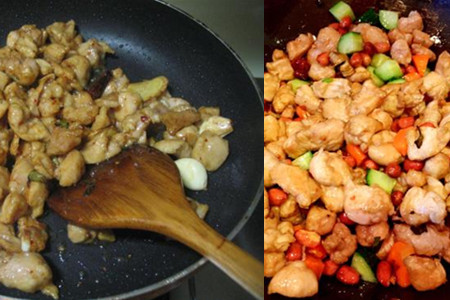 5、往锅中淋上之前制作好的酱汁,使鸡丁充分入味。再倒入切好的黄瓜丁,翻炒片刻后,待汤汁开始收浓后,加入些油炸的花生米炒均即可盛盘食用。花生米不能太早放入锅中,不然会失去其本身的脆口。