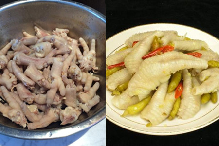 4、在一个准备好的器皿中逐一加入花椒、盐、泡椒,加入适当的开水泡出香味后。再加入些许的生姜片和泡椒水,下入和泡椒量一样多的白醋。把冲泡好的鸡爪放入泡椒水中浸泡四五个钟头,浸泡过程中用筷子翻搅几次,使鸡爪充分入味。把制作好的凤爪放在冰箱中,想吃的时候随时取出便可食用。