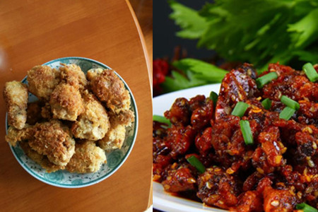 3、在锅中下入足量的食用油,油温烧至七八成时。把之前腌制好的鸡翅块放入油锅之中炸至金黄,就可以用漏勺捞出,沥干多余的油脂。待锅中油温度再次升高后,再次把鸡块放在油锅中复炸一遍。