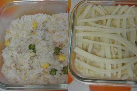 把煮熟的米饭盛入玻璃碗中,用勺子稍微压平一点。然后将拌匀的土豆泥铺在米饭上,用勺子抹平。奶酪撕成细条铺在土豆泥上,放入烤箱的中层,奶酪烤至融化并微微焦黄即可。