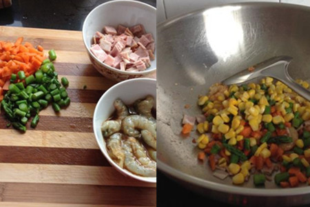食材:米饭1大碗、虾仁100克、胡椒粉、培根、芦笋、玉米粒、胡萝卜、芝士、料酒、盐、油。
