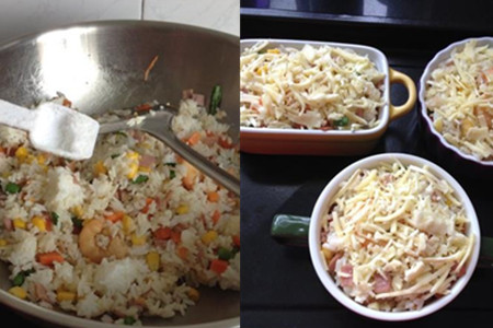 虾仁炒至变白之后,将准备好的其他食材一起下锅,快速炒开,然后加入米饭,调入适量食盐和胡椒粉,翻炒均匀。把炒好的米饭装入烘焙碗里,芝士切成细条撒在米饭上,送入烤箱,180度烤十五分钟左右,芝士变微微焦黄即可。