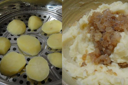土豆削皮切成大块,上蒸锅里蒸熟,土豆块能用筷子轻轻穿透就说明熟透了。取出蒸熟的土豆块,装入碗里,用工具压成泥状,然后调入适量淡奶油,倒入炒好的洋葱碎,搅拌均匀。