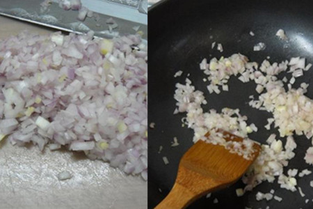 洋葱洗干净切成碎粒,平底锅上灶,注入量多一些的橄榄油,开大火烧热,油温升高之后,倒入洋葱碎煸炒几分钟,再调至小火煸炒。洋葱炒至颜色变深之后,调入适量食盐,炒匀即可关火。