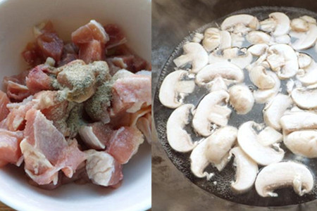 鸡腿洗干净,去掉骨头,切成小块,装入碗里,加适量黑胡椒粉、葡萄酒和盐,拌匀,腌制一个小时左右。口蘑用清水洗干净,切成厚度合适的片状,洋葱洗净切成丁。往锅内注入适量清水,开大火煮开,下口蘑片烫一下,捞出滤干水分。